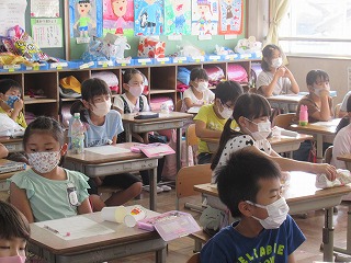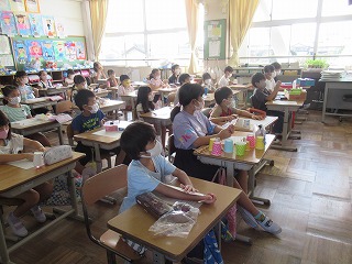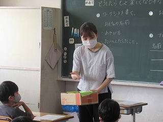 2年1組では、生活科の時間、自分でつくったおもちゃを説明して、どうしたら、楽しく遊べるか考えていました。