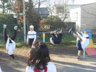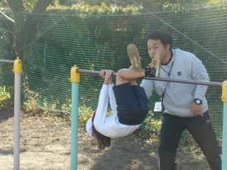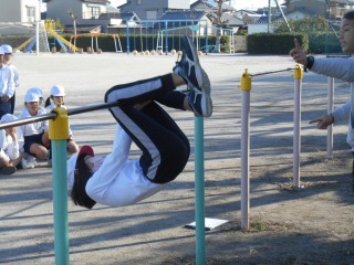 鉄棒で、様々な種目に挑戦していました。難易度が上がると、獲得ポイントが高くなります。