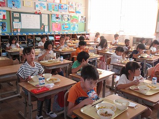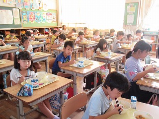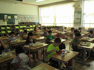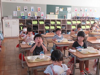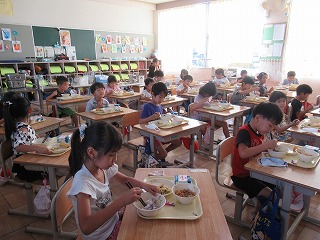 給食の時間、みんな静かに前を向いて給食を食べています。まだまだコロナ対応は続きます。みんなきまりを守って生活できています。
