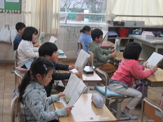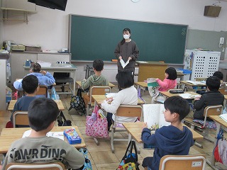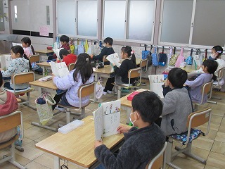 1年2組は国語の時間でした。教科書を姿勢良く持って、みんなで声を合わせて音読を行っていました。
