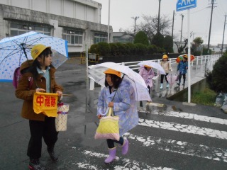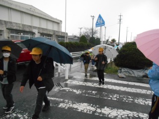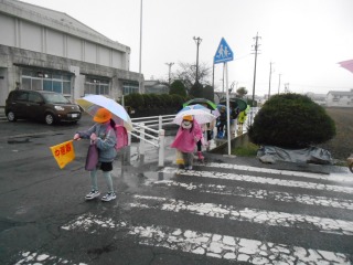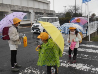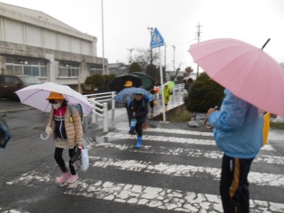 雨の朝となりました。傘を差しながらですが、1列に並んで登校してきました。