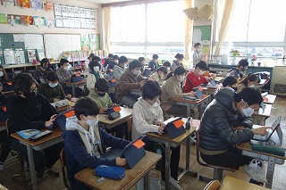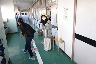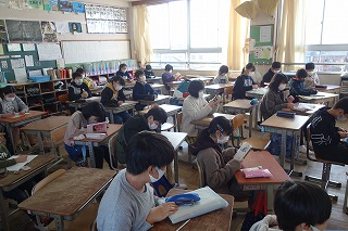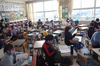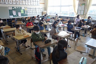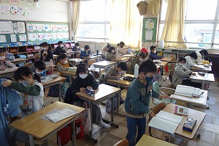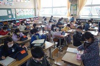 朝の教室では、朝の学習が行われていました。消毒や加湿器の用意などもしていました。
