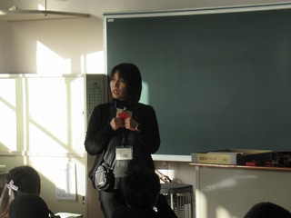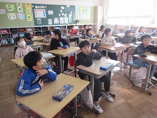 2年1組では、朝の会が行われていて先生の話を聞いていました。