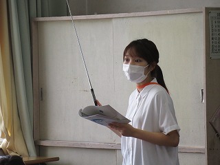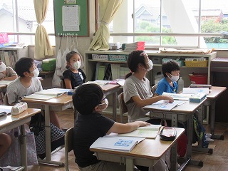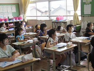 2年1組では、国語の授業が行われていました。モニターに映し出された地図を見ながら、説明を考えていきます。みんなしっかりモニターを見ながら、答えを考えていました。