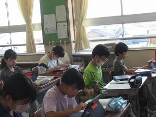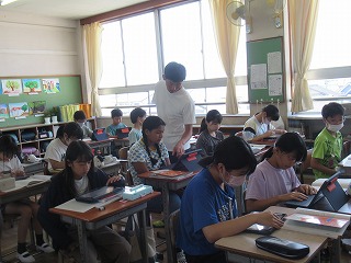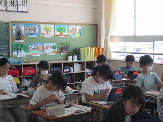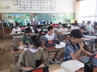 6年2組では、社会の時間、タブレットを使いまとめをしていました。