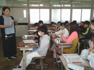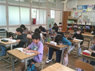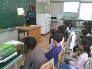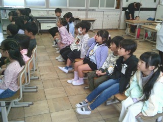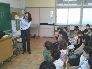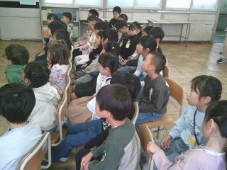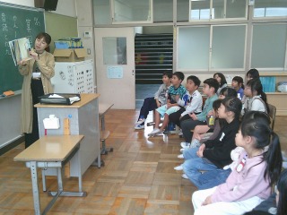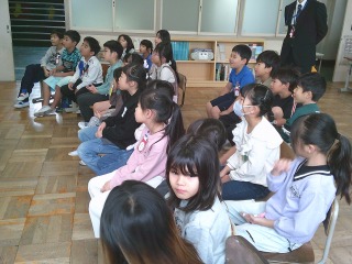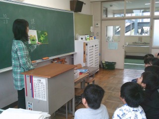 今日は低学年の読み聞かせでした。1年2組では、お月見のお話を読んでいただきました。