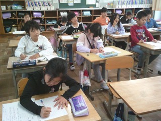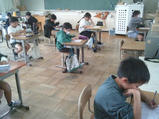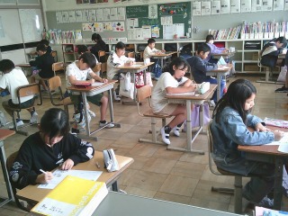 聞き取りテストを行っていました。流れる文を聞きながら、テスト用紙の問題に取り組んでいるところでした。
