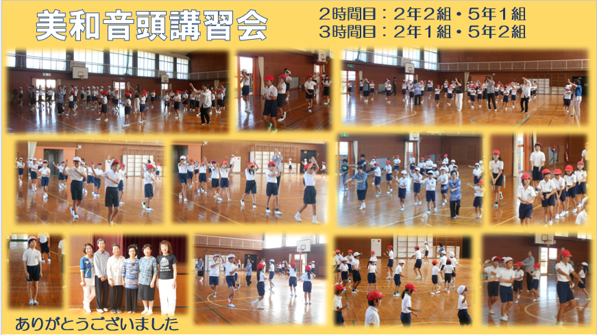 8日の2・3時間目に、2・5年生が参加し、美和音頭講習会を行いました。足の踏み出し方や手の位置を丁寧に教えていただき、曲に合わせて踊りました。お手本を希望した数名が中心に輪を作って踊りました。みんなとても上手でした。運動会当日は笑顔で踊りましょうね。