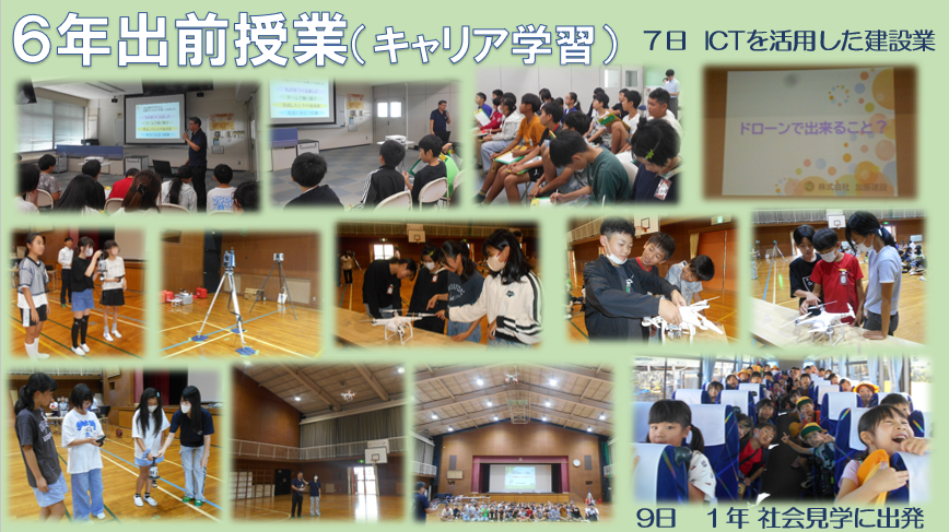 7日の2・3時間目に、6年生が出前授業を行いました。今回は、株式会社加藤建設様を講師として、建設業について学習しました。正確で効率よく作業をするためにドローンや精密機械などICTを取り入れており、ものづくりの技術を感じることができました。