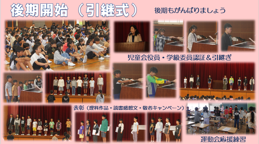 今日から後期が始まりました。引継式を行い、後期の児童会役員と学級委員を認証して、前期より引き継ぎました。また、理科作品・読書感想文・敬老キャンペーンの表彰を行いました。