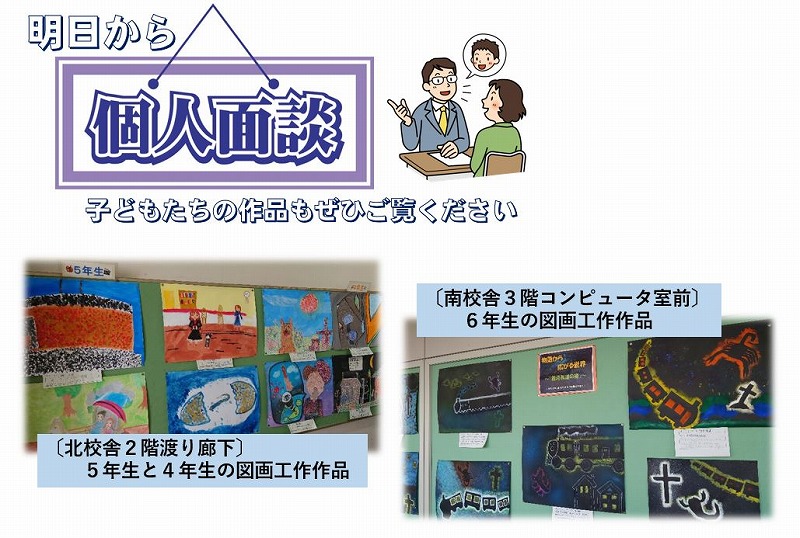 明日から個人懇談です。コロナコロナで多くの制約を受け、安全を最優先しながらできる限りのことに取り組んできた1年もゴールを迎えようとしています。それぞれに一つ上の学年に進級し、6年生は中学校という新しい世界へと巣立っていきます。限られた時間の中ではありますが、担任とともに子どもたちの