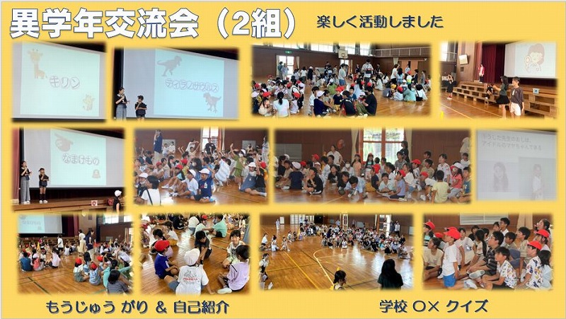 昨日の昼休みと清掃の時間に、児童会主催の交流会(2組チーム)がありました。今度は1年生から6年生の2組(2年生は半数)が体育館に集合し「もうじゅうがりゲーム」と「学校〇×クイズ」を行いました。学校クイズでは、学校や先生についての問題が出され、学校についてたくさん知ることができ、楽しく活動していました。