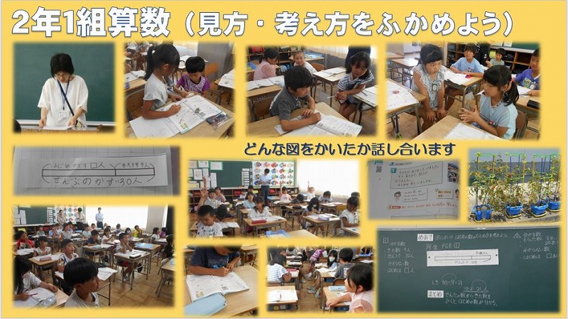 また、今日の2時間目は、2年1組で算数の研究授業を行いました。問題を読んだだけでは何を求めるのかはっきり分からないので、テープ図をかきその関係についてと、答えを求めるには