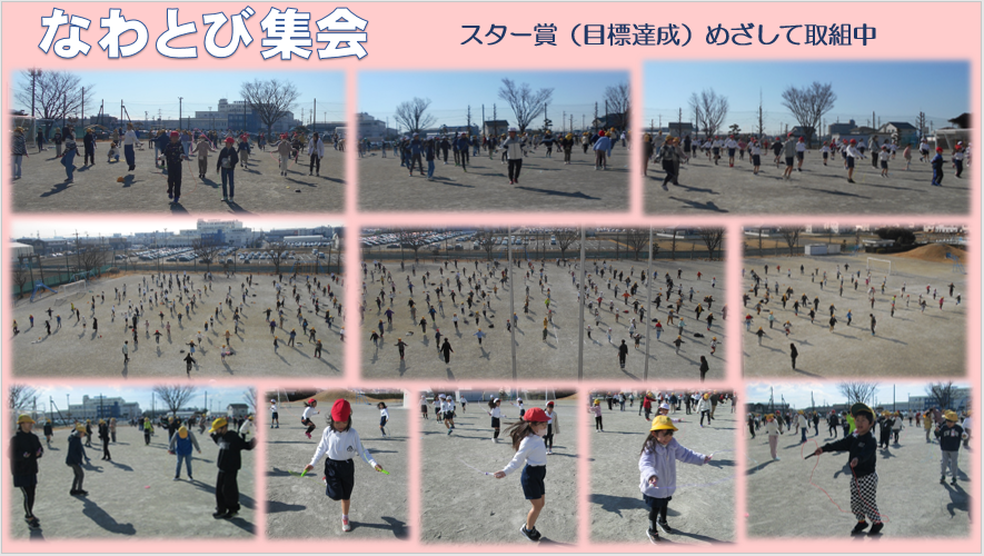 先週から週に2回(火・木)2時間目の休み時間に運動場に集合して、全校でなわとび集会に取り組んでいます。合計6回実施予定で、今日までに3回行いました。練習のあと記録会をし、跳んだ回数を学級で合計していきます。学級で決めた目標回数を達成するとスター(賞状)がもらえます。どの子も一生懸命跳んで回数を増やしています。今日は何回跳べたかな。