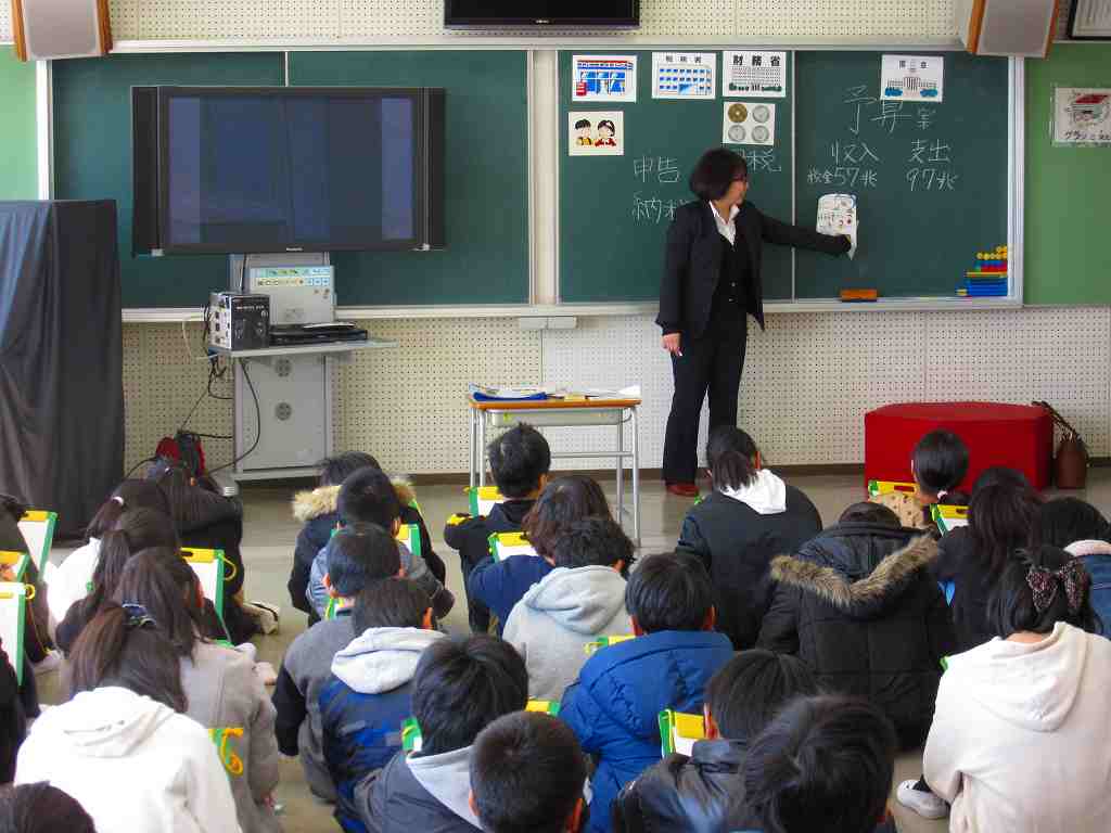 津島税務署から講師の方をお招きし、租税教室を行いました。自分たちが買い物のときに払っている消費税や、家族が払っている様々な税金が、どのように使われているのか知ることができました。社会科の勉強とも関連づけ、子どもたちが世の中のシステムを学ぶ良い機会となりました。
