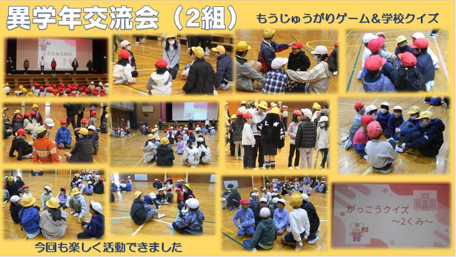 昨日の昼休みと清掃の時間は2組グループの交流会でした。みんなで行うゲームは同じでしたが、学校クイズの問題はすべて1組とは違っていました。みんなが楽しめるように