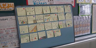 -こんな姿ばかりでないのが現状です!- 新しい学習指導要領の基づいた新しい教育が始まっています。学習面はもとより、生活面でも学び合い深め合う学習を目指して試行錯誤しながら取り組んでいますが、4年生の教室の背面黒板には、一人一人の「清掃時の目標カード」が掲示してありました。互いの清掃に取り組む姿勢のよい点を学び合ってくれることを願ってのものですが、こうした取組をそれぞれの担任が工夫するようにしています。