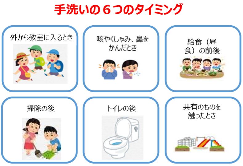 東京は学校でも感染! 「手洗いの徹底」ご家庭でも!! 東京では小中学校で新型コロナウイルス感染が広がっているとのニュースも流れています。幸いにして県内では感染拡大も広がりを見せていませんが、東京都との人の往来も増えてくるばかりですので、危機意識を失うことは許されません! 感染防止は、皆が健康で1日をスタートすることが大前提ですが、マスクの着用とともに「手洗いの徹底」がとても大切です。下記のような場面で、重点的に手洗いに取り組むよう指導しています。その習慣づけには、保護者の皆様のご協力も不可欠です。ぜひご家庭でも、こうした場面での「手洗いの徹底」が図れるようご指導をお願いします。