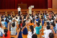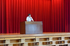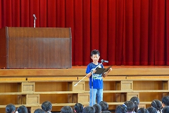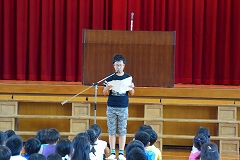 夏休み前最後の朝礼で、5・6年生代表による意見発表。
