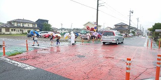 〈車の往来が激しい中、横断する子どもたち〉 〈交通指導員さんが登下校を見守って下さり・・・・〉