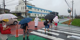 木田橋東の点滅信号は東進南方面からの通学班が通る交差点です。交差する南北の通りは、金岩方面から豊公橋に通じる県道79号への抜け道で、南北に多くの車が通過する上、木田橋方面からくる車もここから南進・北進し、通行量の多いこと有名です。しかし、毎朝、交通指導員さんが見守って下さっているおかげで、子どもたちは安全に登校することができています。班長を任された児童も、横断旗を掲げて班員を安全に横断できるよう気を配り、本当によく頑張ってくれています。