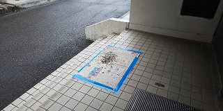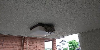 〈体育館玄関の軒下にあるツバメの巣〉 〈フン対策として新聞紙を敷いて・・・・〉