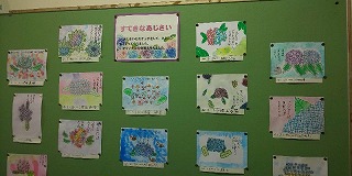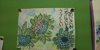 北館2階の渡り廊下付近の掲示板には、4年生の図画工作+国語の作品が掲示してあります。季節の花である「アジサイ」の絵に俳句を添えた素敵な作品がたくさん飾ってあります。感染防止のための多くの制約があるため、楽しいことが少なくなりがちの学校ですが、「一服の清涼剤」となっています。