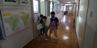 1年生は、子どもたちだけで学校探検に挑戦しています。数名のグループで首に探検バックをさげて、”見つけた”ことを記録用紙に書き取っていました。探検後、教室でそれぞれに学んだことを交流し合う中で、自分の考えを深めあう機会としていけるよう担任が指導しています。