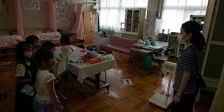 〈職員室入り口で「探検終了シール」を張り付ける児童〉 〈保健室で養護教諭に部屋の説明を聞く児童〉