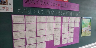 背面黒板を有効に使って、子どもたちの学びを支え、助けています。本日の日付を英語で表示し、日常的に英語にふれ、口にできるよう促しています。「6年生として自分にできること」を子どもたちがそれぞれに書き込んだカードの掲示は、学んだことや感じ取ったことを生活の中で生かしていける知識や技能にまで高めていけるよう、皆で学び合ってくれることを願ったものです。