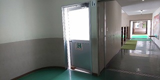 〈非常時の指示・誘導用のハンドマイク〉 〈非常口はいつでも避難できるように〉