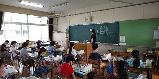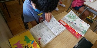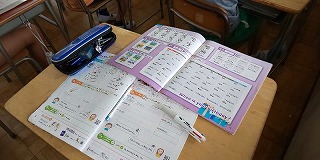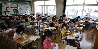 空調設備のおかげもあり、子どもたちは落ち着いて授業に取り組んでいます。6年生の外国語活動では、中学校1年生の学習のように、4本線に合わせて単語のアルファベットを書く学習をしていました。3年生では、国語辞典の引き方の学習を進めていました。4年生では、狭い児童机を有効に使って、水彩道具を配置する手立てからていねいに確認していました。