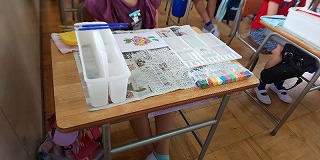 〈配色まで細かくていねいに指導〉 〈狭い児童机を有効に使って〉
