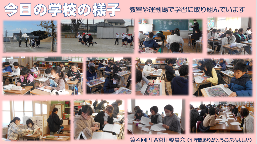 今日の学校の様子です。どの教室でも運動場でもしっかり学習に取り組む様子が見られました。また、午後にはPTA常任委員会がありました。本年度のまとめと来年度の予定について承認していただきました。本部役員の皆様、学年委員の皆様、1年間ご協力ありがとうございました。
