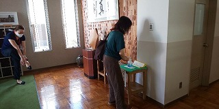 〈消毒液で手指消毒して入館〉 〈感染対策をしての読み聞かせ〉