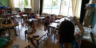 間隔を空けた自分の座席で、机を読み手に向けた状態で読み聞かせとしました。一日も早く、通常の活動ができることを心から願う日々です。
