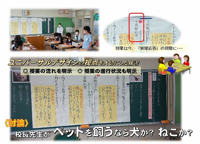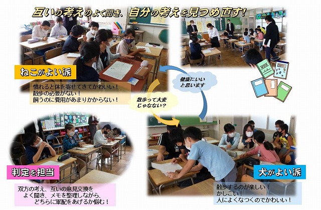 子どもたちが対話を通して、互いの考えをよく聞き、それをもとに自分の考えを深め、高めていくことをねらった授業ですが、発言の重要ポイントが確認できるよう「復唱」する担任の支えを受け、論点が外れた発言もなく、子どもたちはそれぞれに自分の考えを練り直していました。判定者4名の判定が、犬派2、ねこ派2と引き分けとなったことからも、双方、互いに「なるほど」と思わせるような議論が展開されていたことがわかります。担任も子どもたちも、力量を高めた有意義な1時間であり、参観した教員も多くのことを学ぶことができたと思います。
