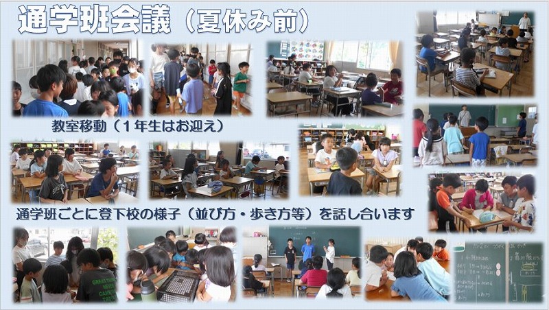 昨日の5時間目に、夏休み前の通学班会議を行いました。これまでの登下校の様子や集合・出発・到着時刻などについて、班長を中心に話し合いました。より安全に登下校できるように、これからも交通ルールを守ってくださいね。