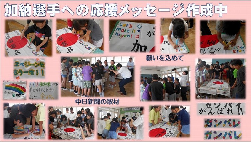オリンピックでの活躍を願って、応援メッセージを作成しています。1年生から順番に、学級で考えたメッセージを一人一人心を込めて書いています。本日は5年生の担当日で、中日新聞の方がちょうど取材にきました。明日以降に、6年生と児童会役員が仕上げます。どんな応援メッセージになるか楽しみです。
