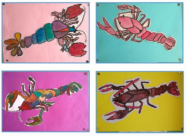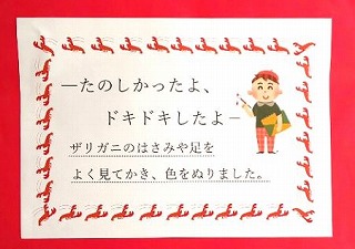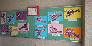 子どもたちの作品紹介「第2弾」は2年生の作品を紹介します。ザリガニをよく見て、細かいところまでしっかりと描かれていました。周囲を切り取り、カラーの台紙に張り付けた作品は2年生とは思えない出来栄えでした。