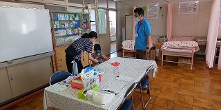 来室者どうしの間隔を大きく開けさせたりして養護教諭が対応しています。エアコンを作動させていても、出入口や窓を開けて、