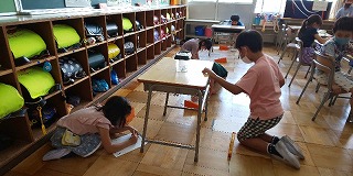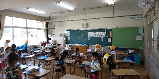 登校後の子どもたち、1年生は少しずつ学校生活に慣れ、到着後、すぐに荷物の整理に取り掛かっています。さらに荷物を整理したら、すぐに手洗いをきちんとする習慣もついてきました。