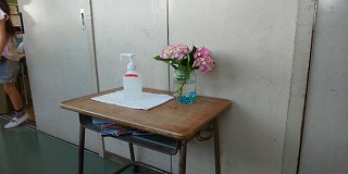 〈さわやかな朝の陽ざしを受ける校舎〉 〈4年生廊下には消毒液とともに季節の花も・・・・〉