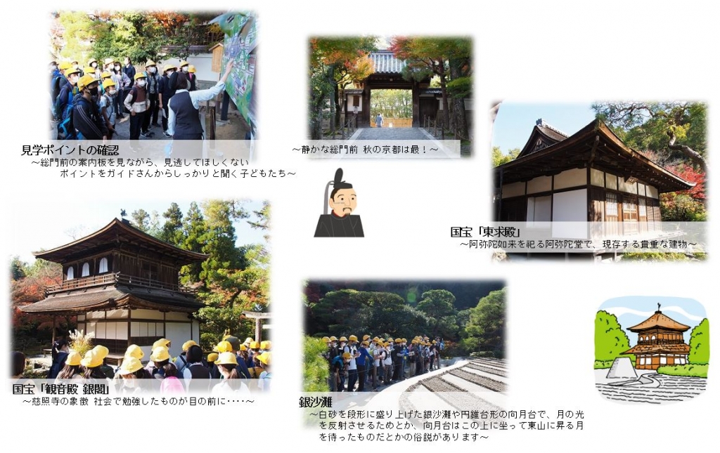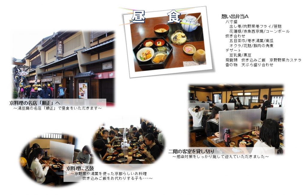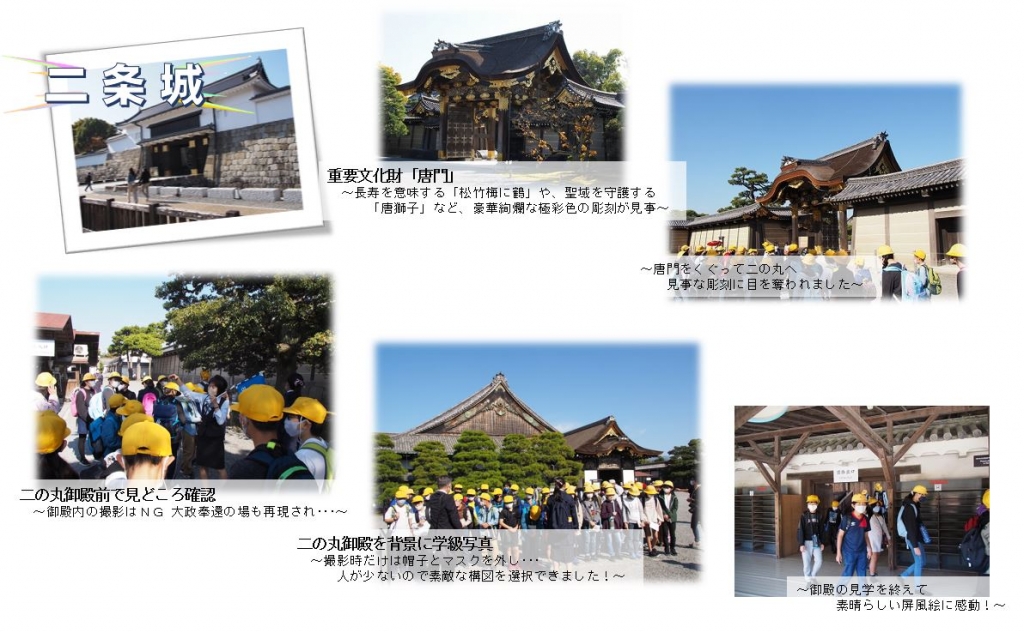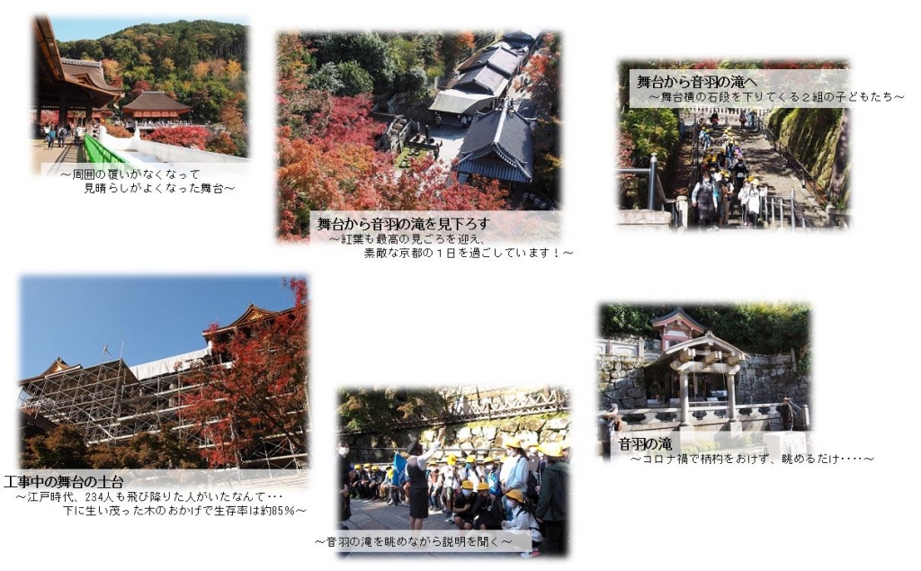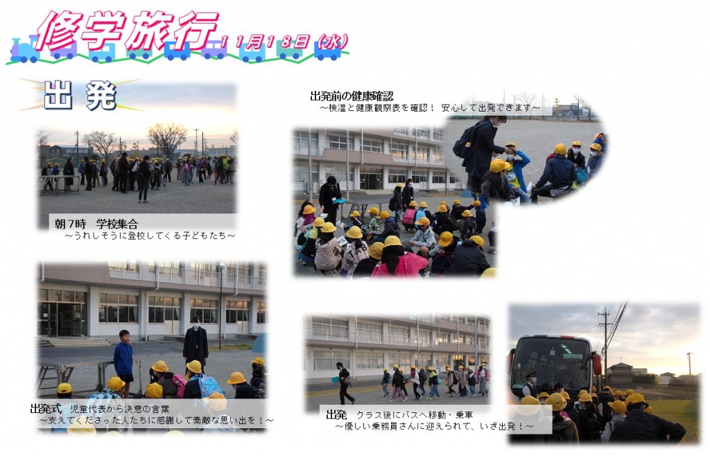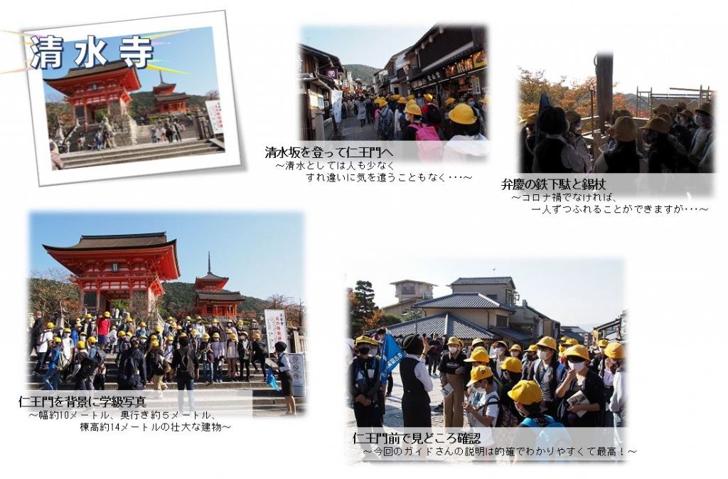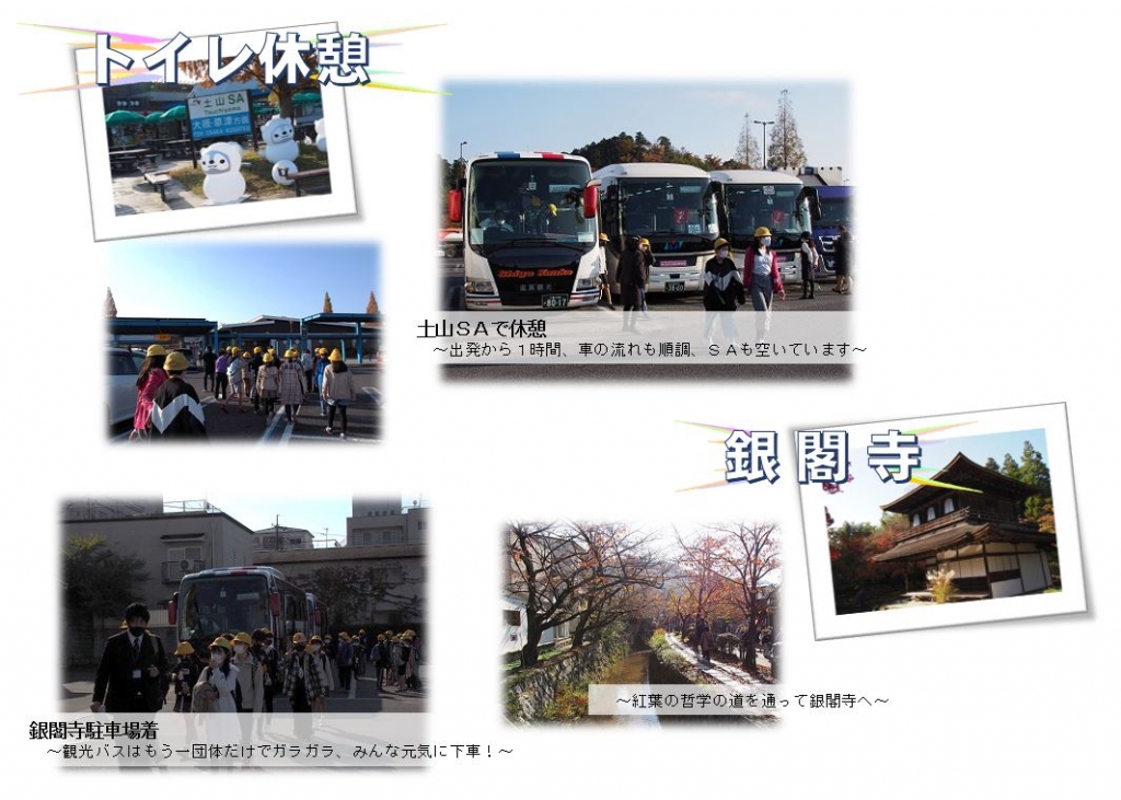 感染拡大が心配される中、日帰りではありますが、京都への修学旅行を実施することができました。京都での見学時間をできる限り確保したく、7時20分の出発でしたが、保護者の皆様のご協力で時間通りに集合が完了できました。家庭でしっかりと健康維持に努めていただいたおかげで、朝、健康確認をしながら、検温をしましたが、皆、平熱で健康状況にも問題はありませんでした。