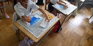 【本日の授業の一コマ】 1年1組では、昨日のアサガオの押し花を生かして絵の制作が進んでいました。植木鉢を描き、その上に押し花を散らして茎や葉を描いていくようです。5年1組は、雨が降る前の時間を使って、運動場で写生の着色に取り組んでいました。大きな画板に絵を固定し、色の混ぜ具合に工夫を凝らして取り組んでいました。