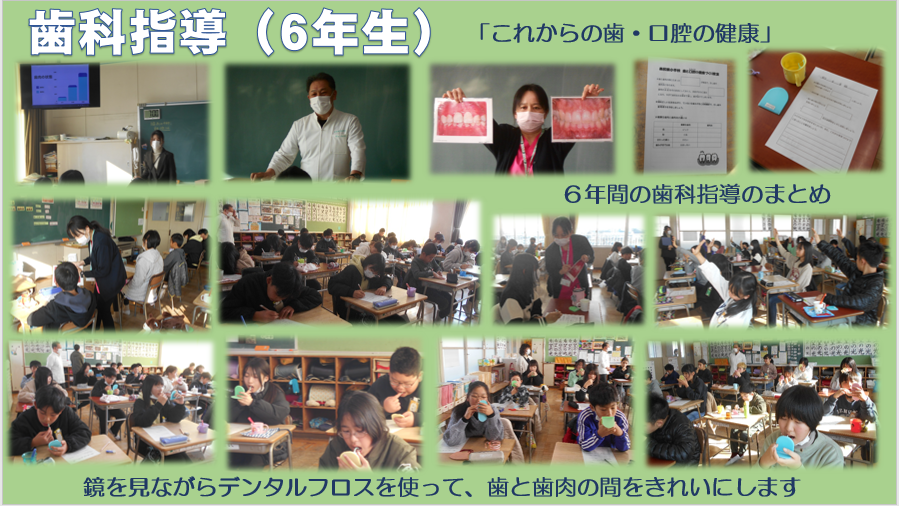 今日の1・2時間目に歯科指導がありました。これまで6年間、口腔内の健康について学習してきました。そのまとめとして、今まで学習してきたことを復習しながら、口腔内の健康を保つために歯みがきや食事の生活習慣が大切であることを再確認しました。さらに、デンタルフロスを使って丁寧に歯垢(プラーク)を落とすことも体験しました。これからも歯や歯肉が健康であるように歯みがきなどに取り組んでいきましょうね。