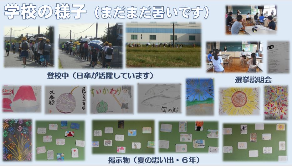 暑い日が続きます。登下校でも日傘を使わなくてもよくなるのはまだ先のようです。これだけ暑い日が続くと体調不良が心配されます。「早寝・早起き・朝ごはん」「適度な運動と水分補給」で残暑を乗り切ってほしいと思います。