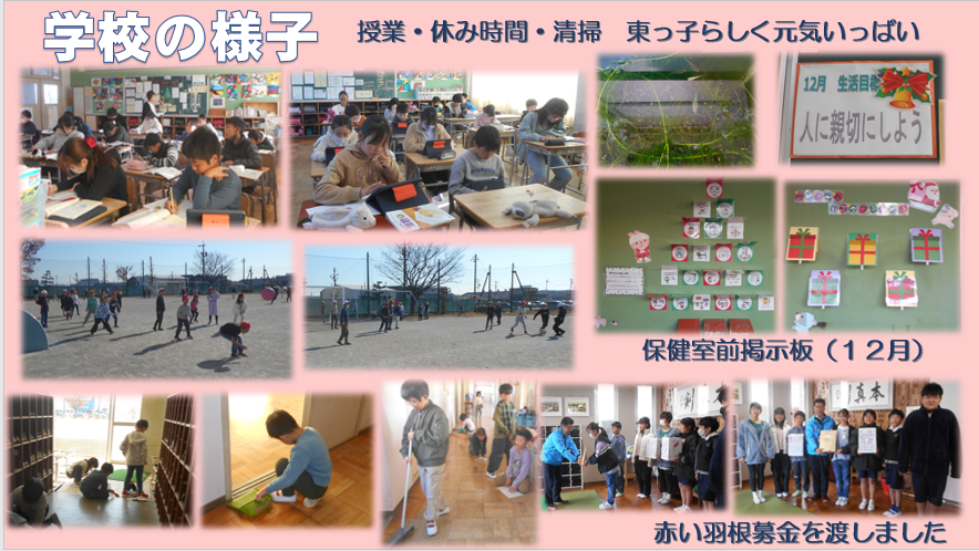 いつもどおり子どもたちは元気いっぱいです。毎日いろいろな活動にがんばっています。先週、児童会役員が赤い羽根共同募金をあま市社会福祉協議会に渡しました。ご協力ありがとうございました。