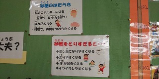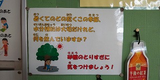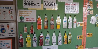 飲料水をたくさん必要とする季節だからこその掲示が保健室前の掲示板に用意してあります。様々な飲料水に含まれている糖分の量をくいず形式で知ることができ、飲料水を正しく取ってもらうためために学んだほしいことをクイズ形式でまとめたものです。関心のある飲料水のペットボトルをめくると解答が出てくるものですが、こうしたことに関心をもち、少しでも