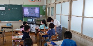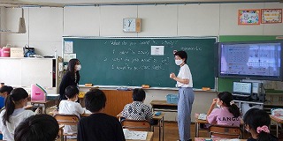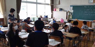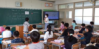 と訪ね、指名された児童が「○○○が学びたいです」と答えるというやりとりをみんなで見た後、隣同士で訪ね合っていました。ここでも感染防止の観点から、互いにななめに向き合うようにしていました。英語学習ゆえ、互いの口の動きも見合いたいところですが、自粛せざるを得ないのが現状です。